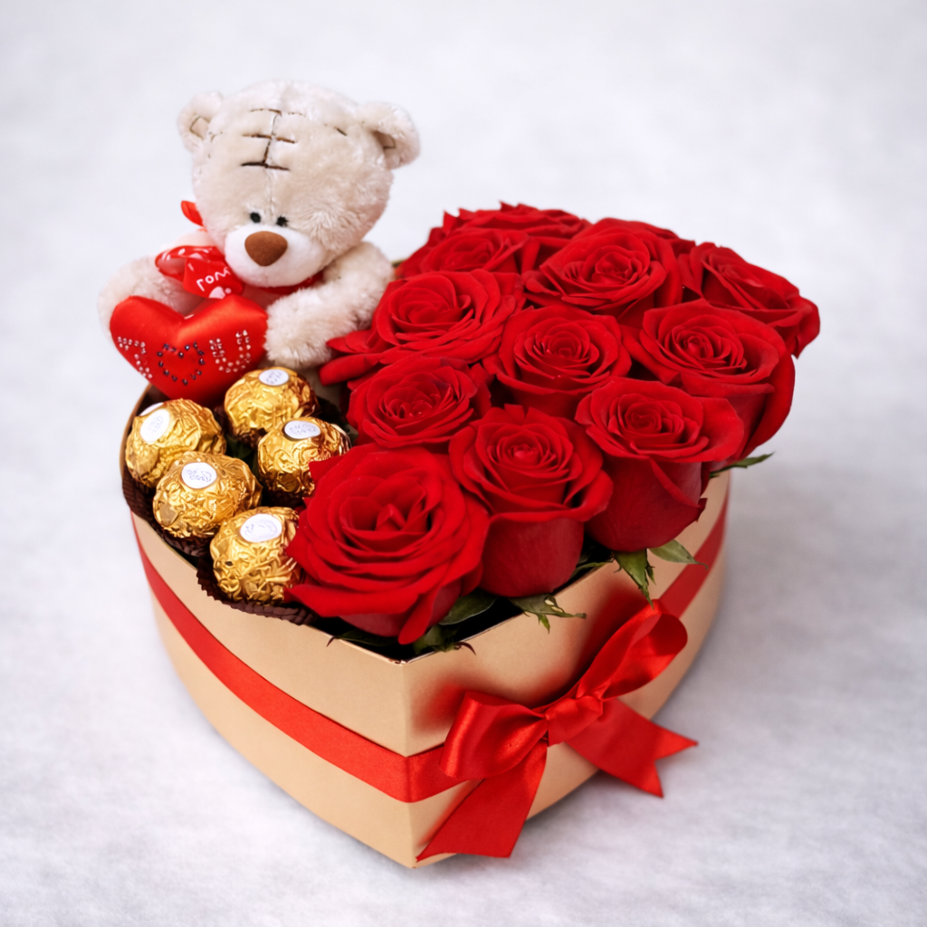 Box corazón con 12 rosas, 5 chocolates Ferrero Rocher y osito pequeño.