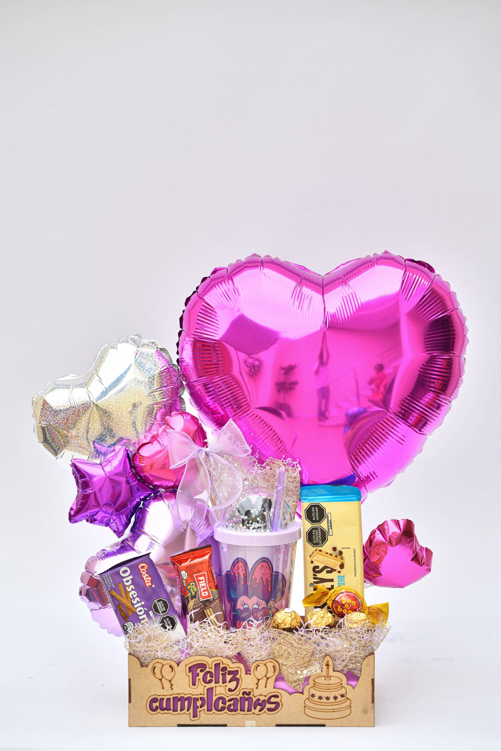 - Box 1 globo metálico grande + 2 globos metálicos medianos + 3 globos metálicos pequeño + chocolate rocher x3 + chocolates varios x3 + 1 vaso tomatodo + 1 hershey.