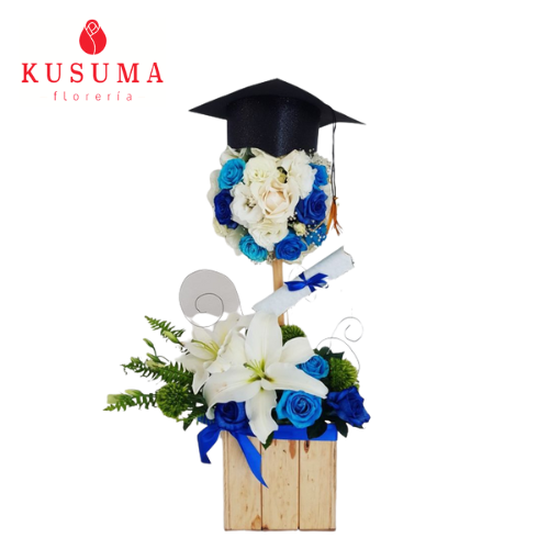 Basket Lilium Graduación 18 rosas,2 lilium, follaje mirto pergamino