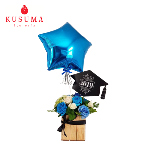 Basket Star Graduación con un globo estrella 12 rosas, mirto y toper de graduacion