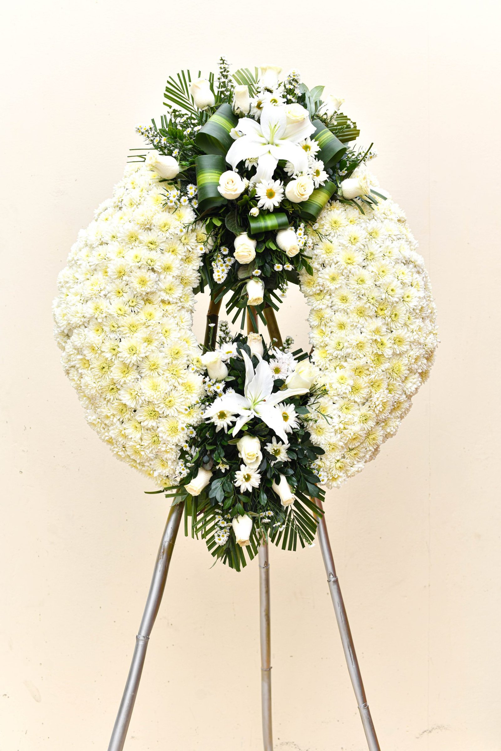 . Corona con Pompos , 12 rosas , 2 lilium y follage.
