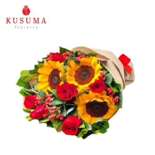 - Arreglo con 6 rosas ,3 girasol y heperico