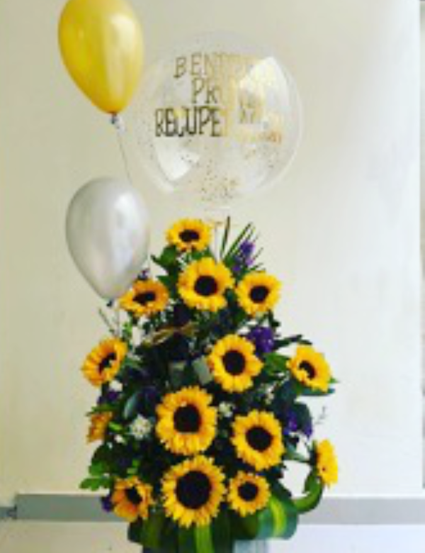 Arreglo con 12 girasoles, follaje, dos globos con helio y globo personalizado.
