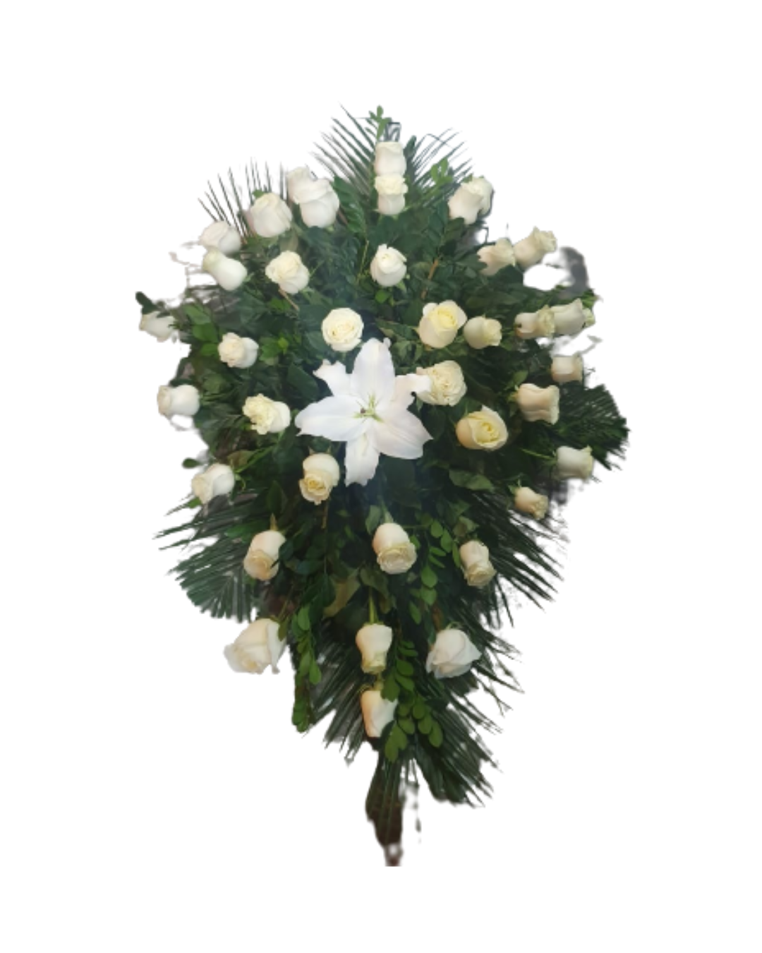 Lágrima con 32 rosas y un lilium ,palmeras y follage