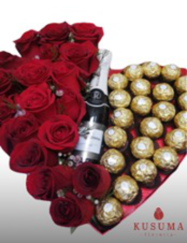Box corazón con 12 rosas, 22 chocolates Rocher Ferrero, Riccandonna pequeño.