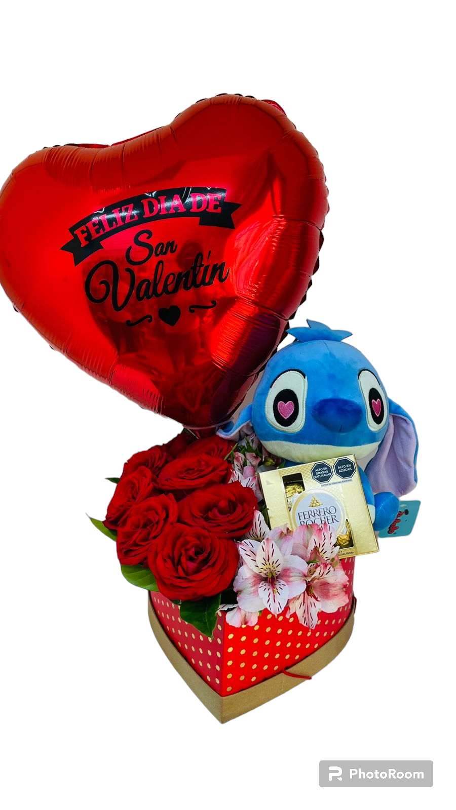 - Box corazón con con 10 rosas, peluche stitch mediano, chocolate Ferrero Rocher, follage y globo metalico