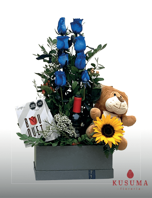 Box con 12 rosas, girasol, vino Queirolo pequeño, peluche, chocolate Hersey y acompañado de follaje fino.