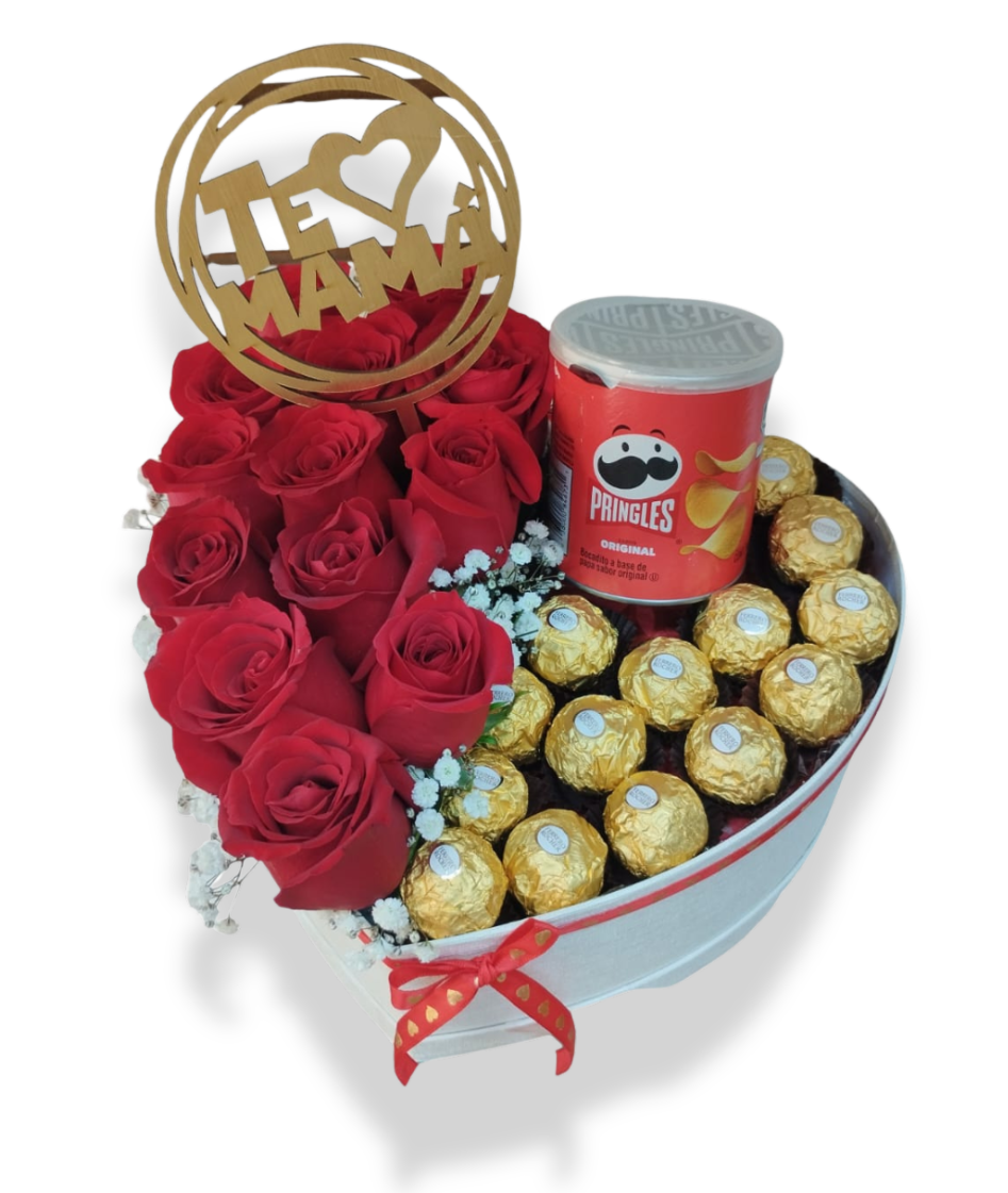 Box corazon con 12 rosas,14 chocolate Ferrero Rocher, papita y Topper