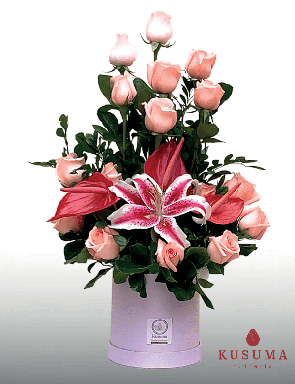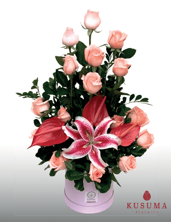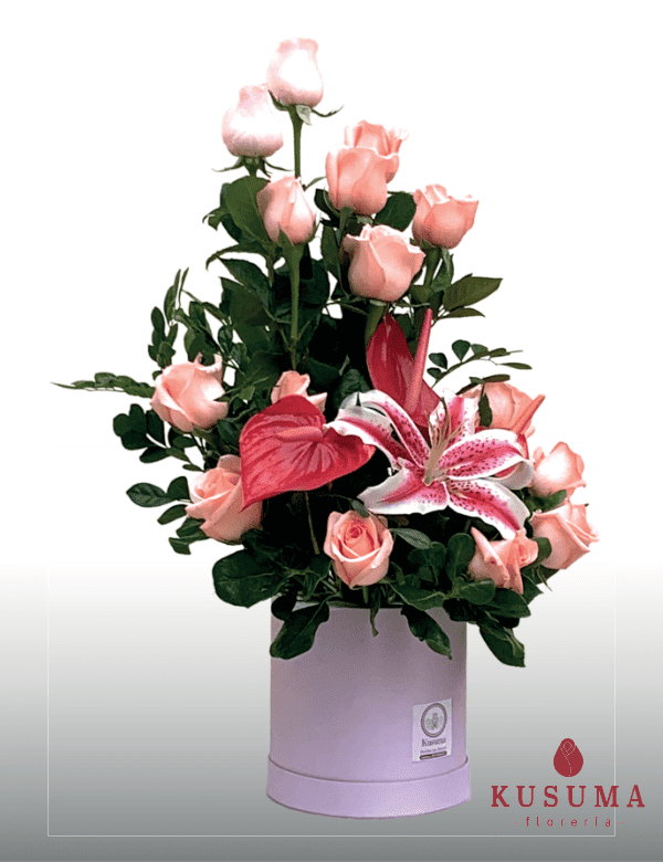 Box con 12 rosas acompañado con un lilium, anturio y follaje.