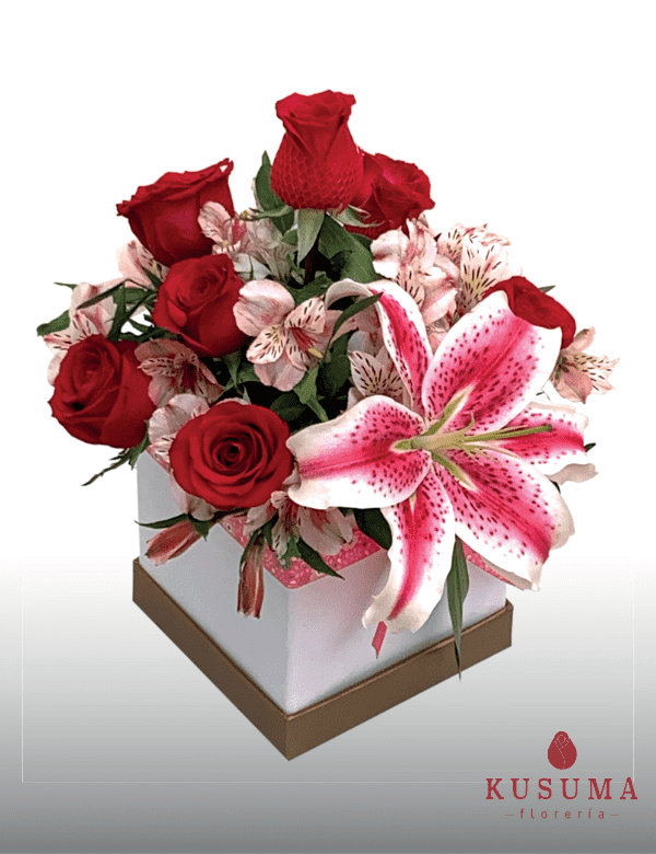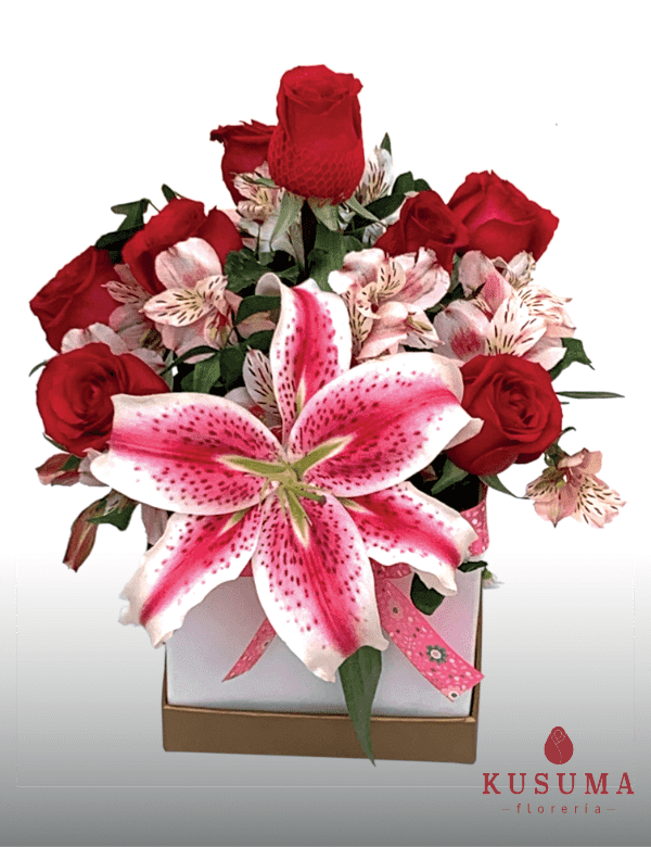 Box con 09 rosas acompañado con lilium, astromelia y follaje.