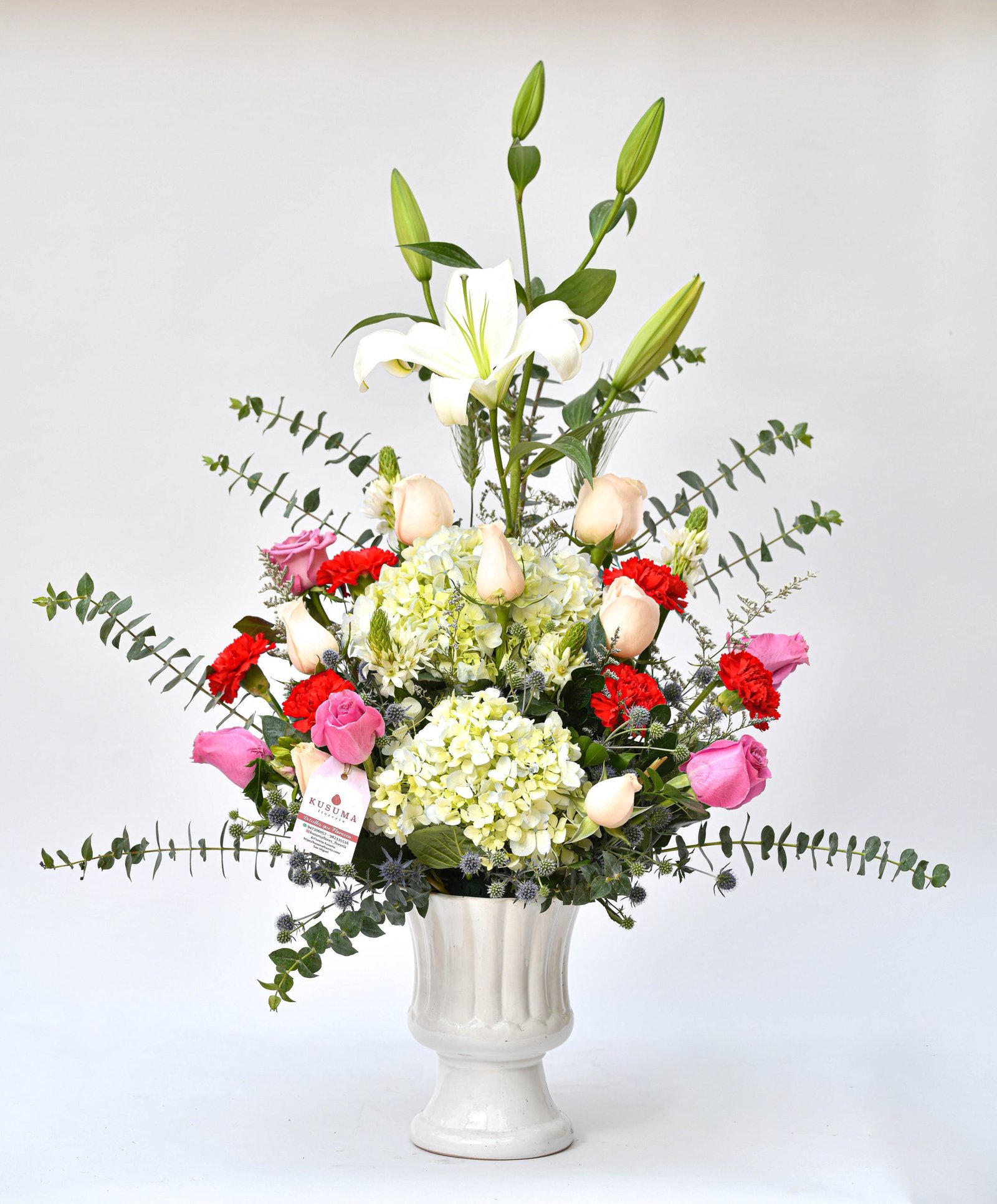 La imagen del producto es referencial, considerando que las flores y los follajes tienen temporadas. Algunas bases, canastas, floreros, globos y peluches también están sujetos a stock disponible. El asesor de ventas coordinara sobre la valoración mínima al diseño original