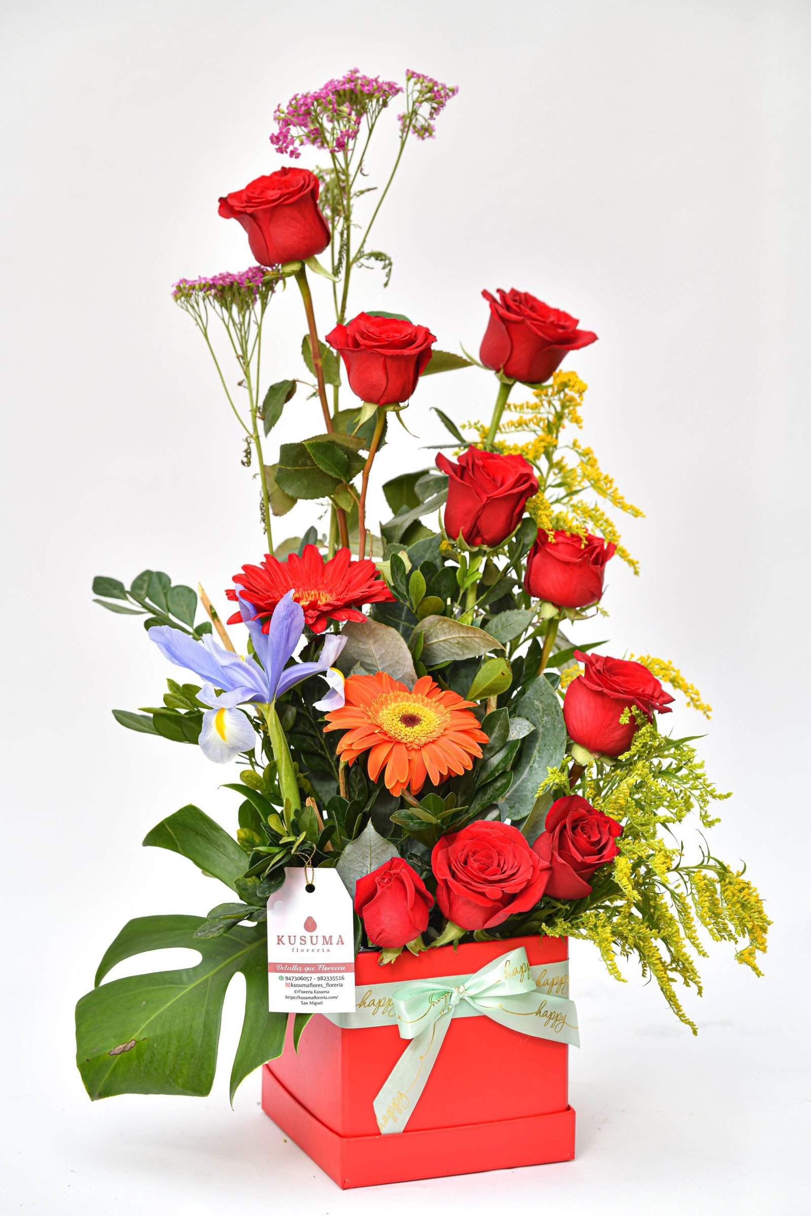 Arreglo 9 rosas + 2 gerberas + iris + follage.