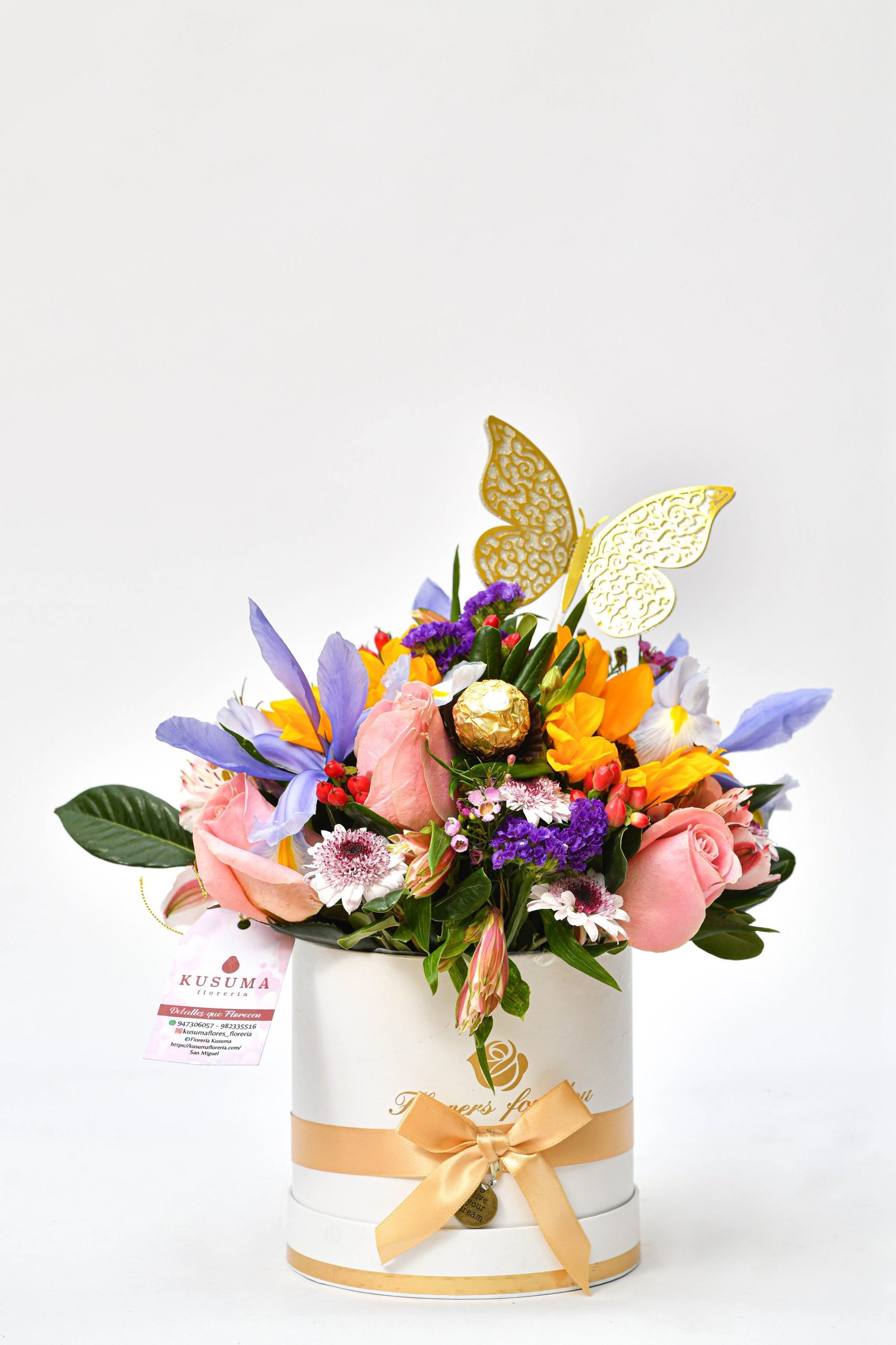 La imagen del producto es referencial, considerando que las flores y los follajes tienen temporadas. Algunas bases, canastas, floreros, globos y peluches también están sujetos a stock disponible. El asesor de ventas coordinara sobre la valoración mínima al diseño original