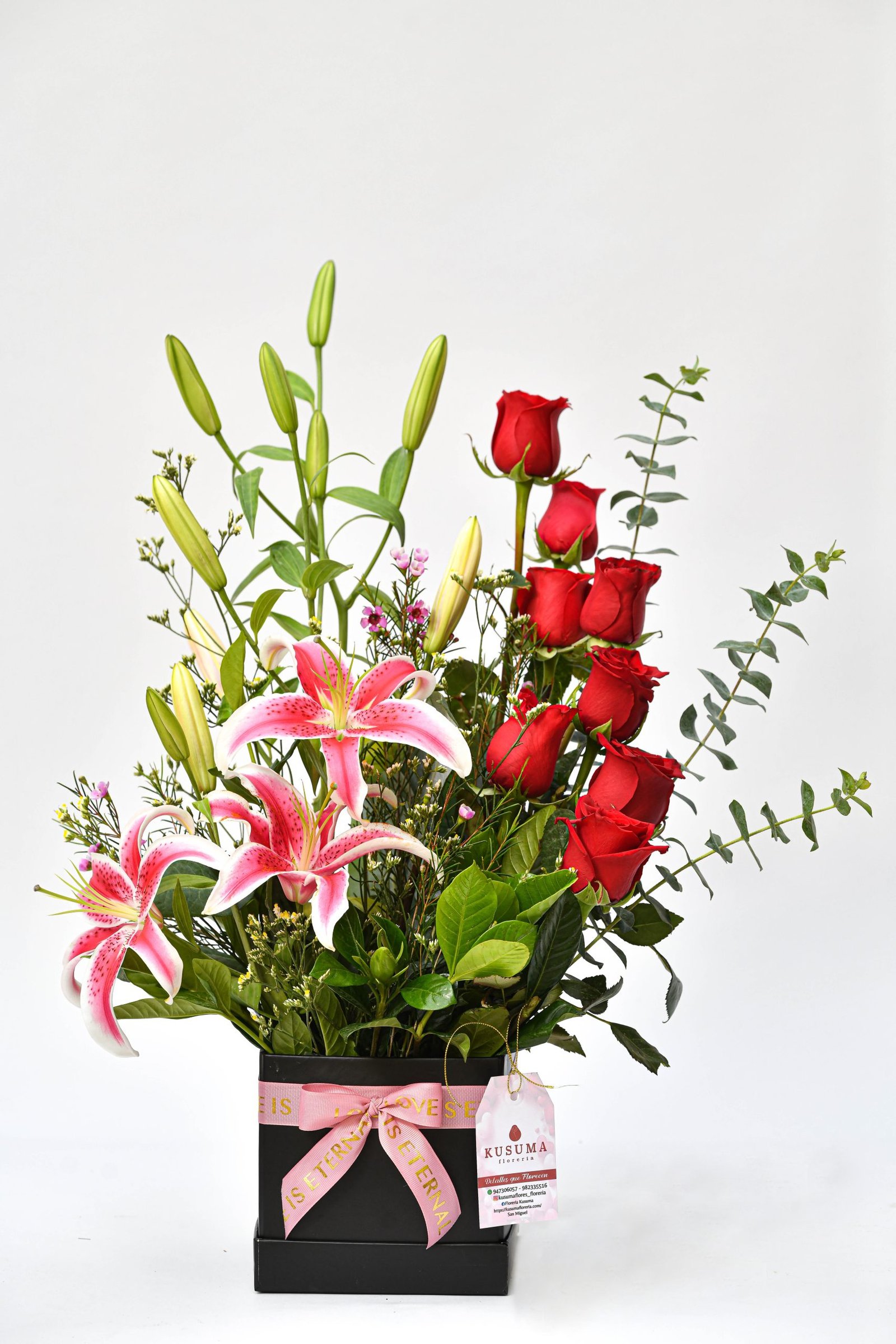 La imagen del producto es referencial, considerando que las flores y los follajes tienen temporadas. Algunas bases, canastas, floreros, globos y peluches también están sujetos a stock disponible. El asesor de ventas coordinara sobre la valoración mínima al diseño original