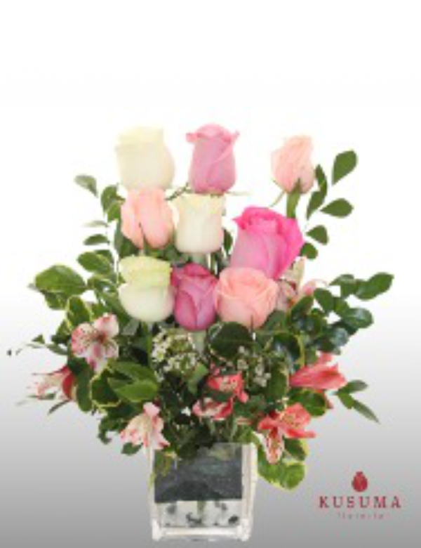 Mini florero con 9 rosas, astromelias y follaje verde.