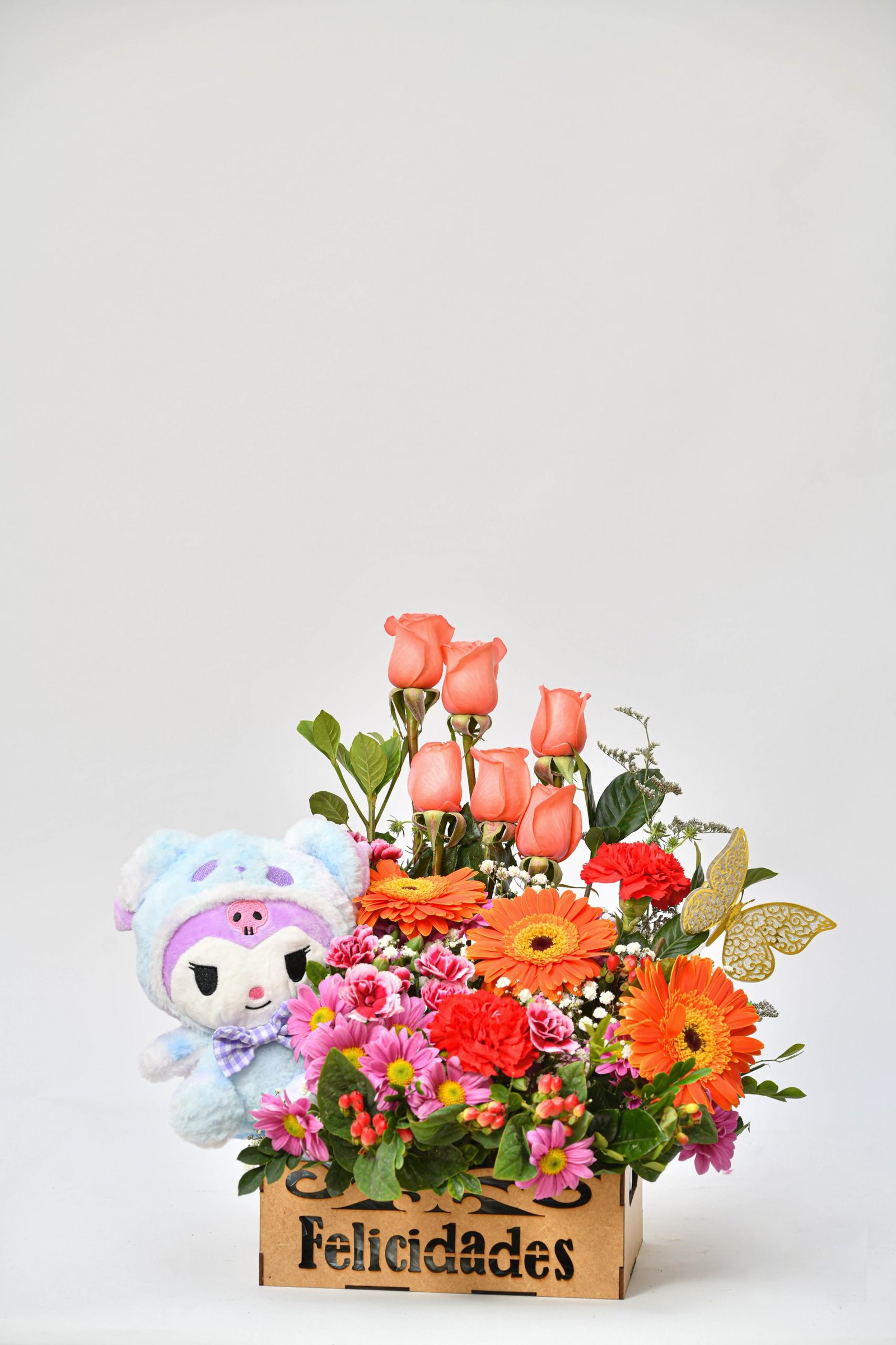 Arreglo 6 rosas + 3 gerveras + peluche + follage.