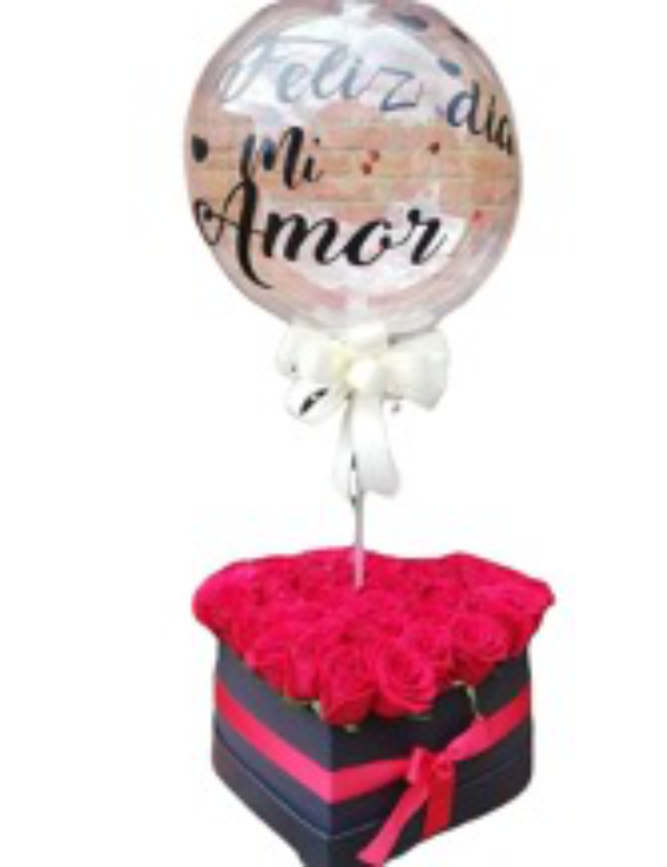 Box corazón con 30 rosas, con globo personalizada