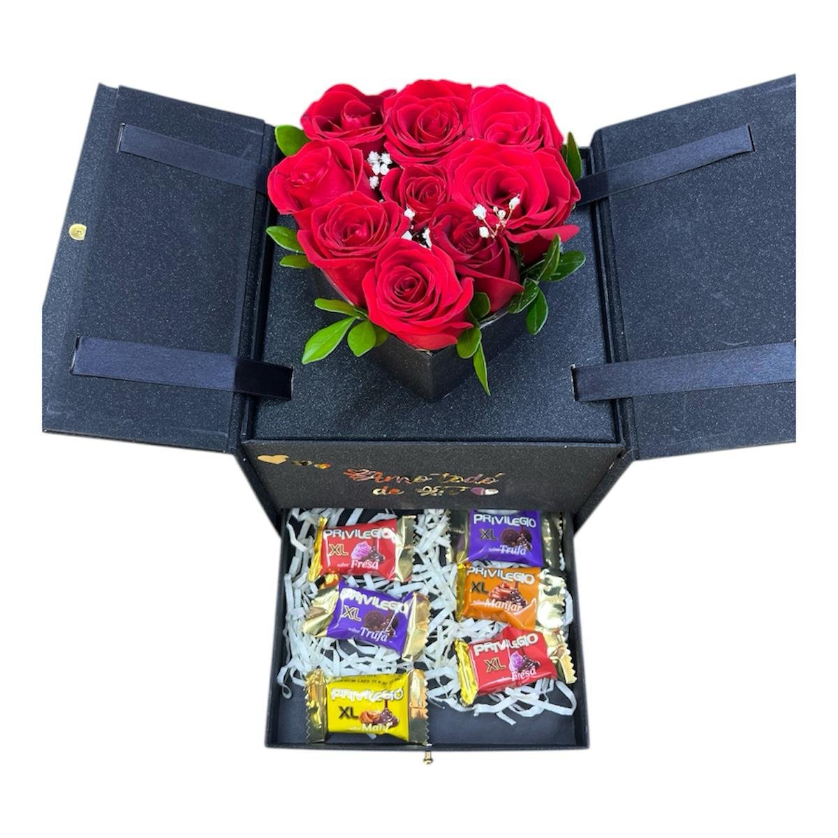 - Box corazon con cajonera 9 rosas, y 6 chocolates