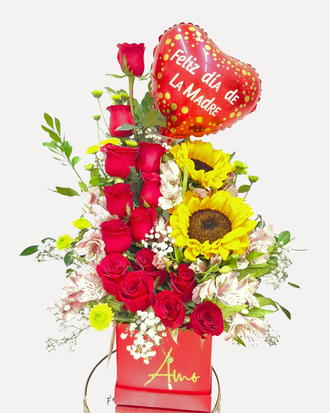 Box con 14 rosas, 2 girasoles, astromelia, globo metálico pequeño, y follaje.