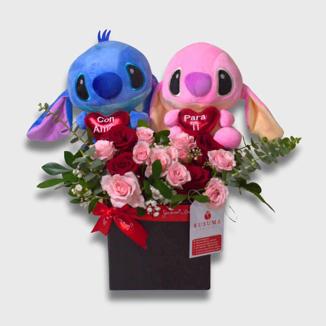 Box con 5 rosas rojas, 03 rosadas, mini rosas y peluche pareja Stitch.