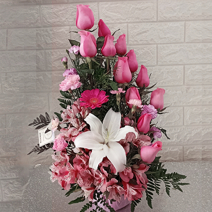 Arreglo con 12 rosas, gervera, astromelia, claveles, lilium y follage