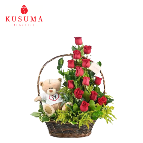 Canasta primaveral con 12 rosas, follage, incluye peluche pequeño