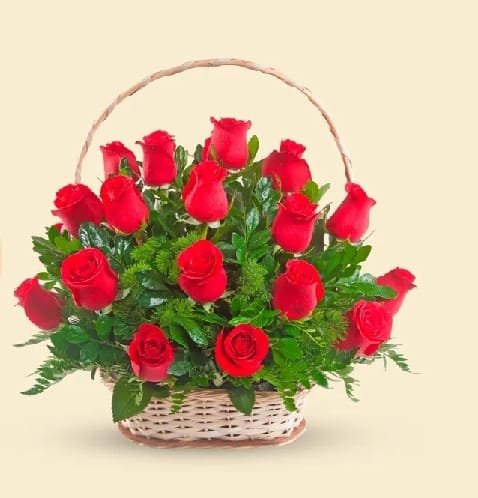 Canasta con 16 rosas acompañados de mirto.