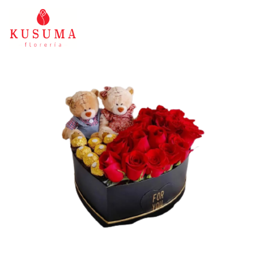 Corazón de osos con 15 rosas , 7 chocolates Rocher Ferrero con 2 ositos
