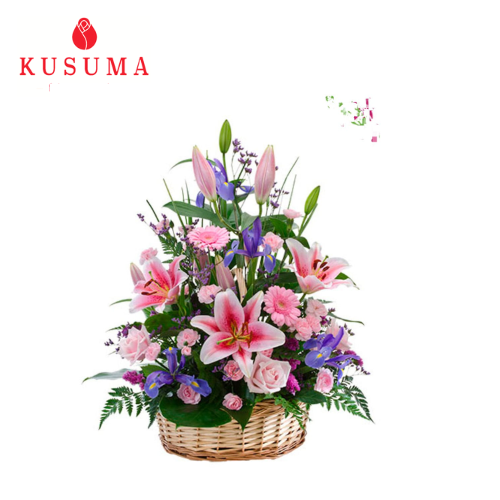 - Basket Primavera con 5 rosas,lilium , gerberas , claveles , iris hechos