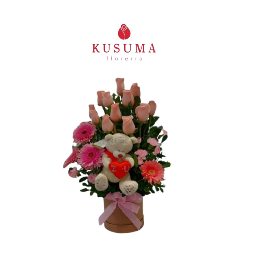 - Sombrerera Teddy con 12 rosas , peluche , follaje fino , claveles , mirton , 3 gerberas .