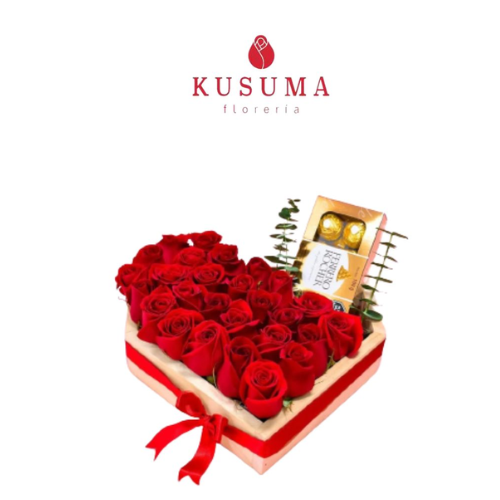- Box romance con 27 rosas, eucalipto chino, chocolattes Rocher Ferrero