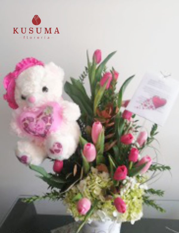 La imagen del producto es referencial, considerando que las flores y los follajes tienen temporadas. Algunas bases, canastas, floreros, globos y peluches también están sujetos a stock disponible. El asesor de ventas coordinará sobre la variación mínima al diseño original.