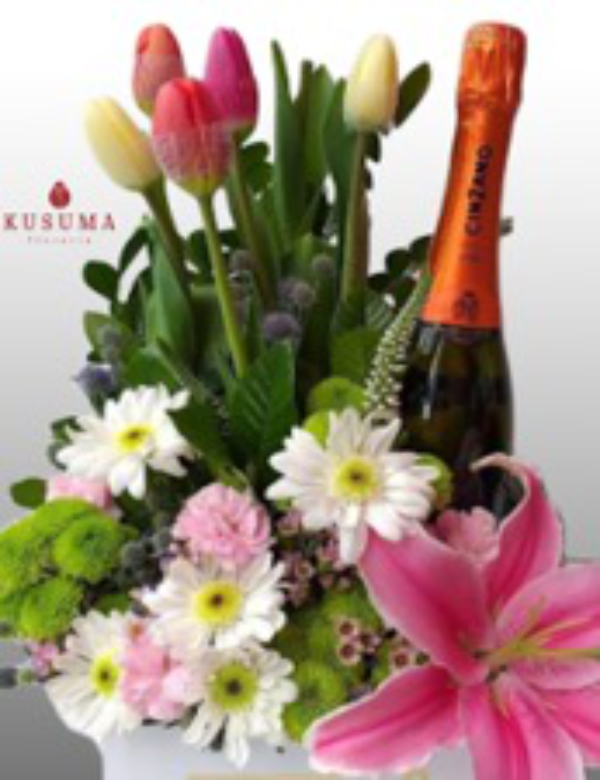 Arreglo con 6 tulipanes, lilium, margarita, follje, espumante Cinzano 750 ml.
